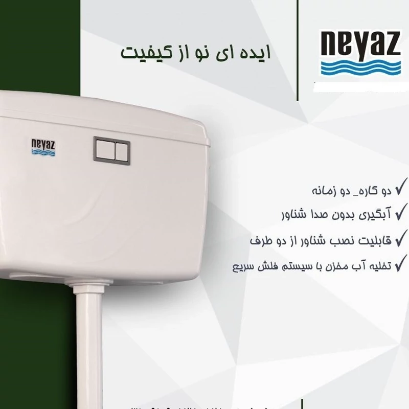 فلاش تانک نیاز با حجم دوحالته ۴ الی ۸ لیتر بیشترین بازده تخلیه با کمترین میزان مصرف آب دارد.
