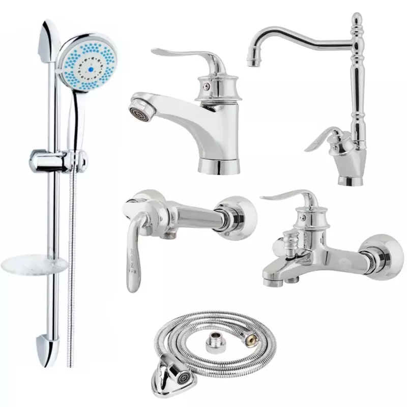 ست شیرآلات مدل هلنا پلاس مجموعه 6 عددی کروم به همراه علم دوش حمام و شلنگ سرویس بهداشتی