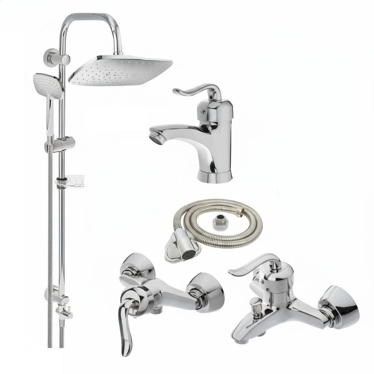 ست پنج عددی شیرآلات مدل قاجاری به همراه علم دوش دوکاره رسوبگیر اتومات شامل یک ست شیرآلات بهداشتی مدل قاجاری، یک عدد علم دوکاره رسوبگیر اتومات و یک عدد شلنگ توالت