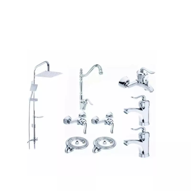 شامل 6 عدد شیر با لوازم نصب ( 6تا شیلنگ تکپایه سه هشتم6 عدد زانو لنگی برنجی ،6 عدد قالپاق 3 بسته بست زیر بندی ) دوش یونیورست دوکاره شیر دار مربع شیلنگ آفتابه استیل 2 عدد استاندارد رنگ کوره ای نیکل کروم کارتریج 40