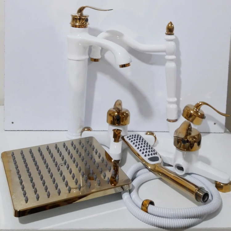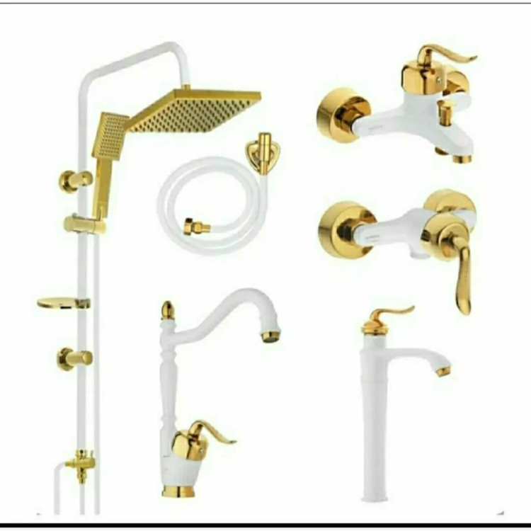 ست شیر آلات شش تیکه سفید طلایی با روشویی پایه بلند قاجاری