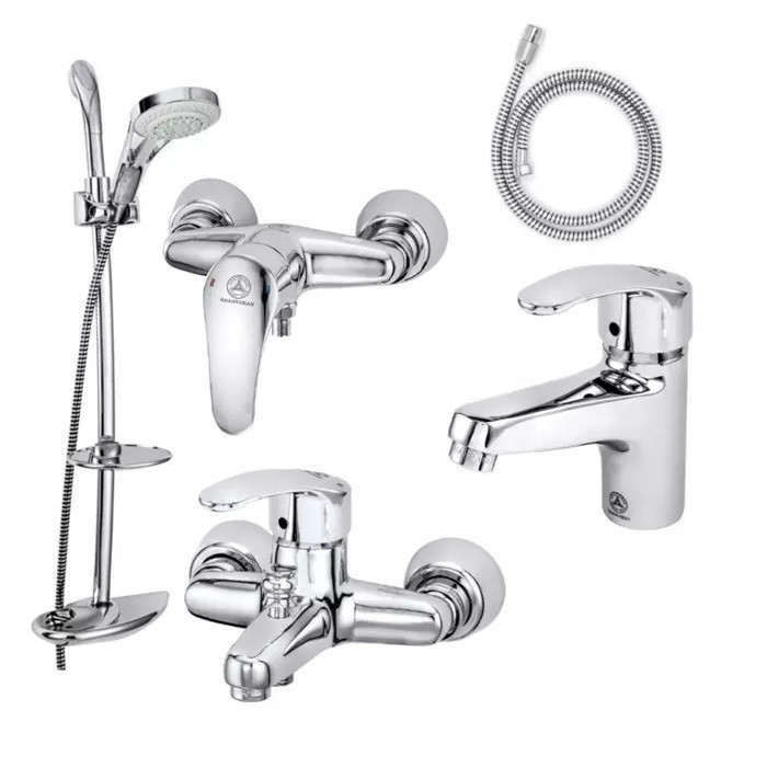 ست شیرالات 5 تکه قهرمان مدل اسپانیایی یک مجموعه مناسب برای سرویس بهداشتی و حمام است که شامل شیر توالت اسپانیایی، شیر روشویی اسپانیایی، شیر دوش اسپانیایی به انظمام علم دوش دنا قهرمان و شلنگ توالت قهرمان است.