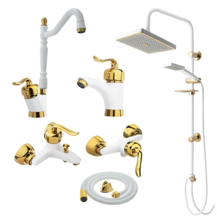 ست 6 تیکه شیرآلات قاجاری سفید طلایی به همراه علم دوش 2 کاره و شیلنگ توالت