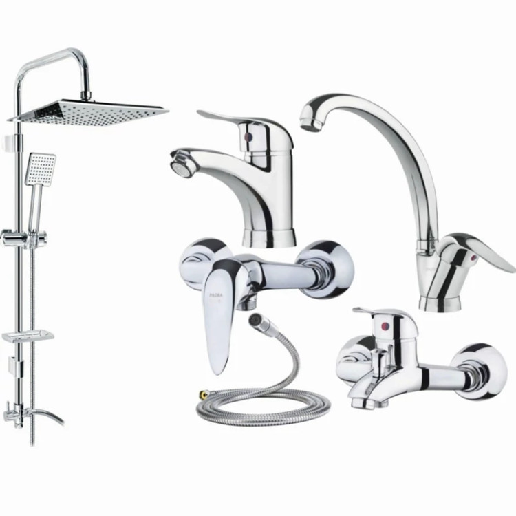 ست شیرالات اهرمی تنه سنگین استاندارد مجموعه 6 عددی به همراه علم دوش حمام دوکاره تمام استیل و شلنگ توالت